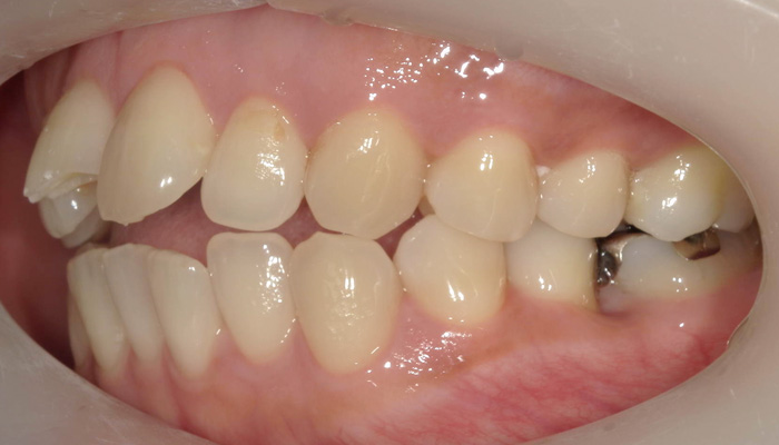 前歯が噛んでいなく奥歯に負担がかかっており、ご本人も全体的に口元が前に出ているのを気にされていました。また転んで右上の前歯が欠けてしまっている状態です。