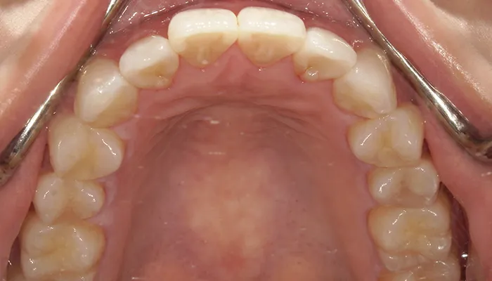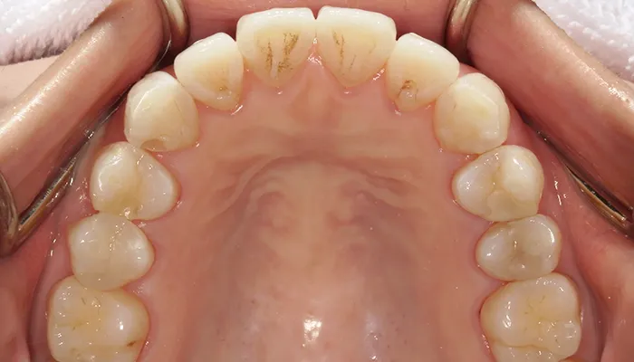 - 患者様の頑張りもあり歯並びがキレイになりました。今後は保定装置を着用し、後戻りを防止しながら、キレイな状態を維持するため、定期的にメンテナンスを行っていきます。